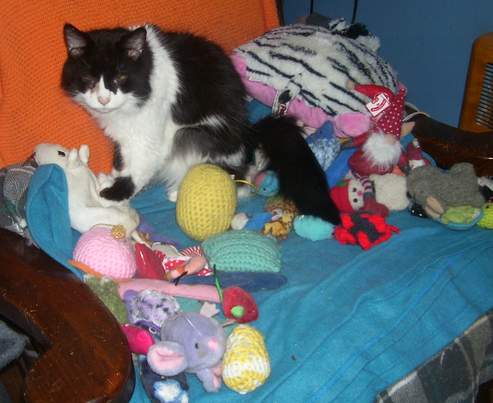 That is one mountain of toys! Lucky kitty!